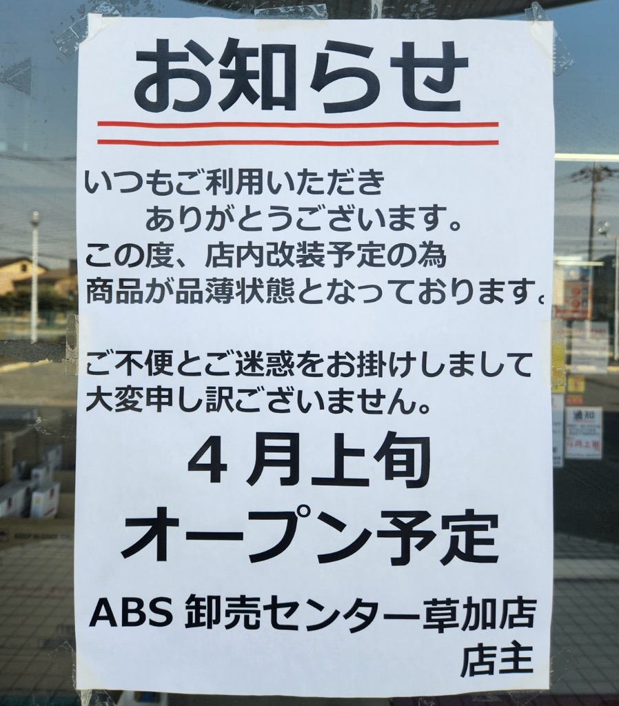 実はこちらの「ABS卸売センター草加店」、2025年3月下旬に、4月上旬オープン予定で改装されると情報提供をいただいておりました。