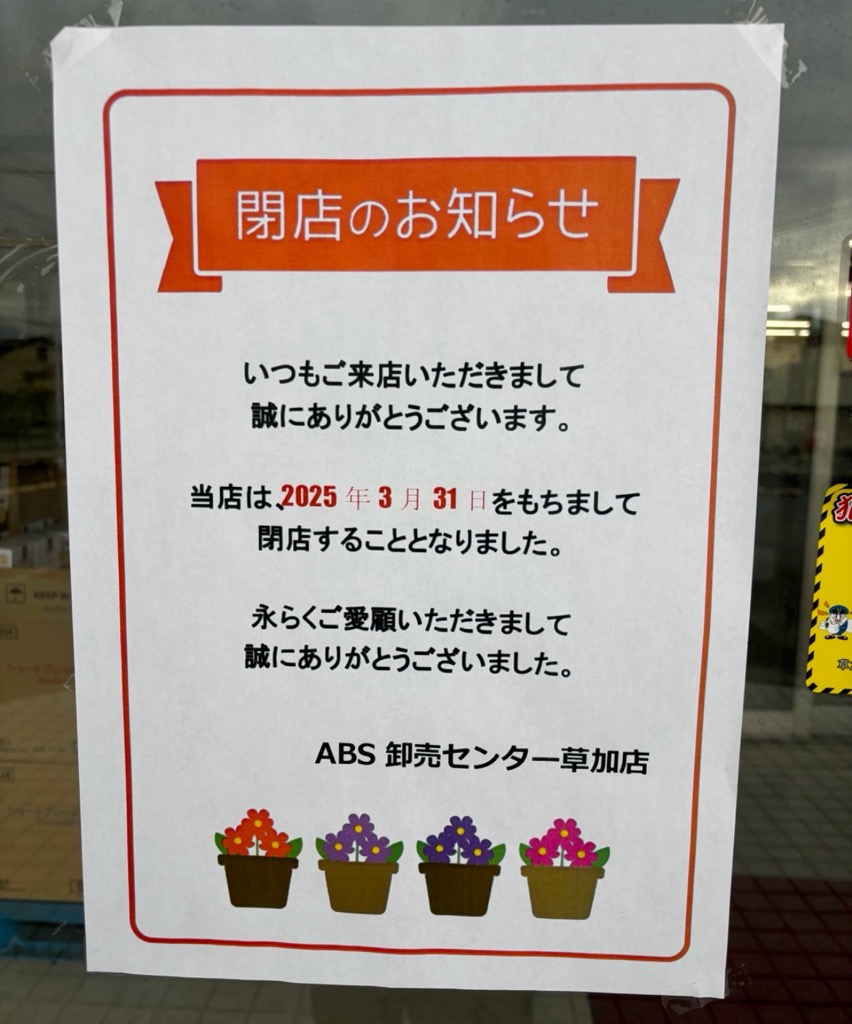 「ABS卸売センター草加店」は2025年3月31日(月)をもって閉店されていました。