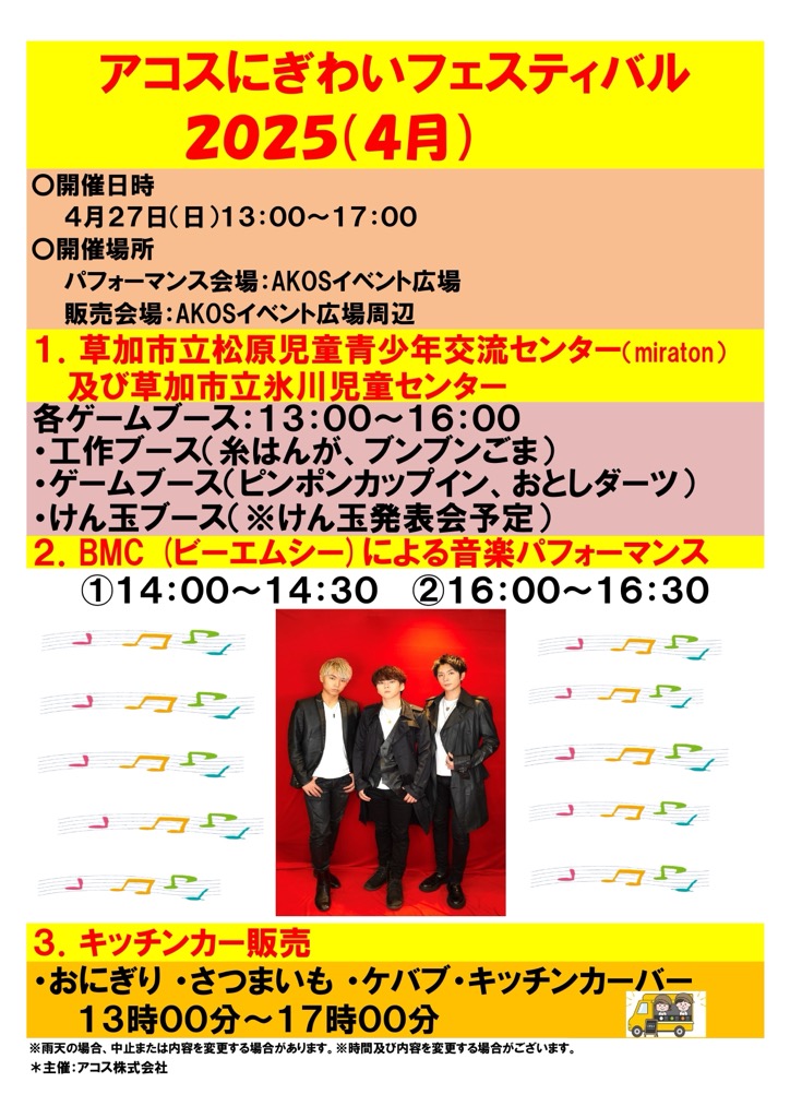 今月2025年4月は、お子様を対象としたゲームブース、そしてTiktokアカウントのフォロワー数26万人超えの3人組男性ヴォーカルグループ「BMC(ビーエムシー)」による音楽パフォーマンスで盛り上がります。