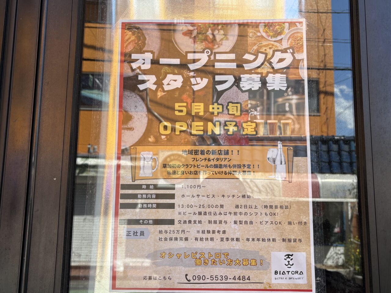 店頭に貼りだされているオープニングスタッフ募集の貼り紙によると、フレンチ&イタリアンのお店で、草加初のクラフトビールの醸造所の併設が予定されているようです。