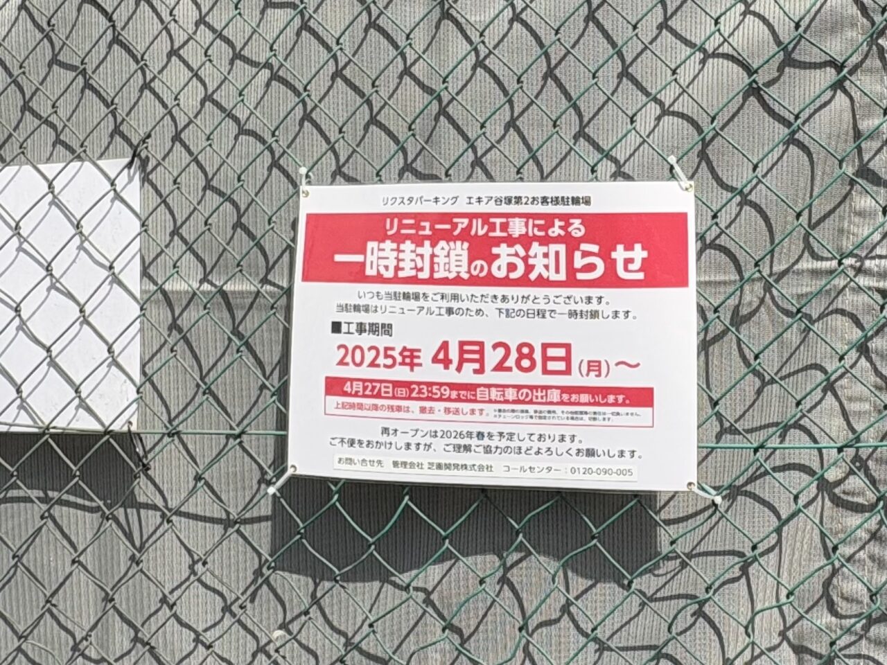 また、リニューアル工事に伴い、谷塚駅西口側(「ミニストップ谷塚駅前店」前)の「エキア谷塚第2お客様駐輪場」は一時封鎖。