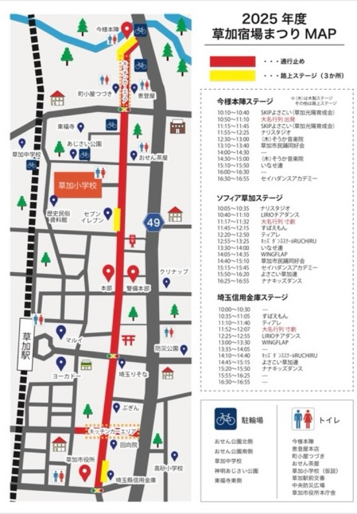現在、会場となる旧日光街道周辺では、交通規制の看板が立てられるなどの準備が始まり、「草加宿場まつり」公式ホームページでも各イベントの詳細が発表されています。