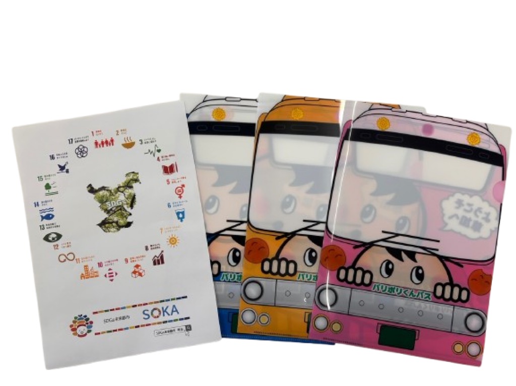 プレゼント:パリポリ君クリアファイル、SDGsの紙製クリアファイル、ペットボトルの水