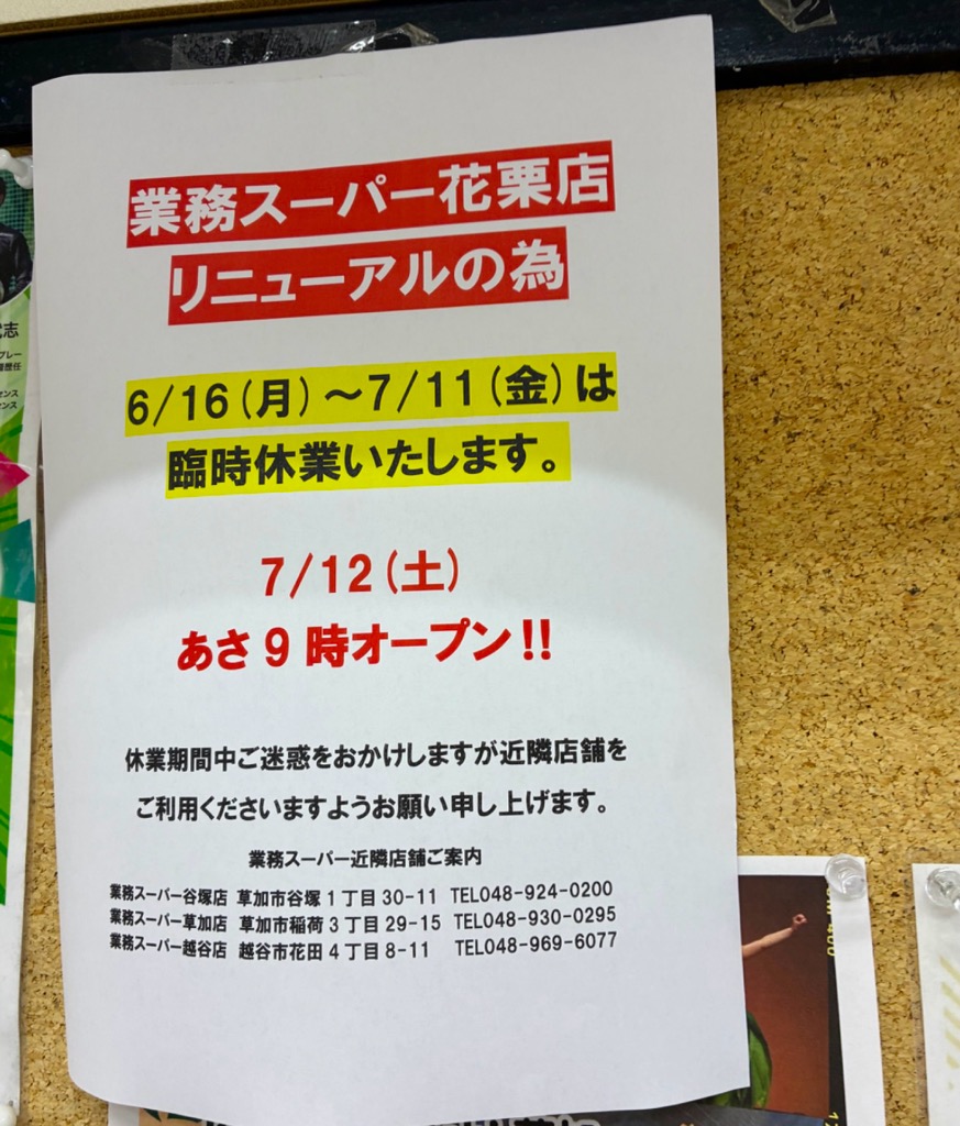 【草加市】「業務スーパー花栗店 」がリニューアル!約1ヶ月の臨時休業が発表されています。