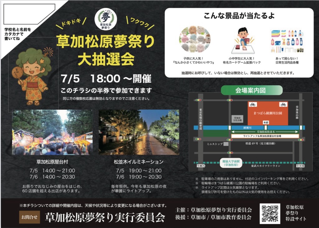 ※草加市内の小中学生を対象に、学校で配られたチラシの応募券を持参で参加できます。