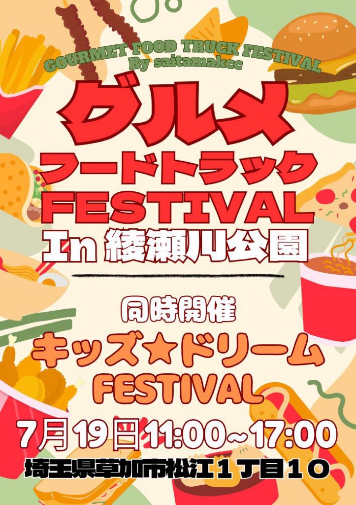 まもなく2025年7月19日(土)、「グルメフードトラックFESTIVAL in綾瀬川公園」、そして「キッズ☆ドリームFESTIVAL」が同時開催されると情報提供をいただきました!