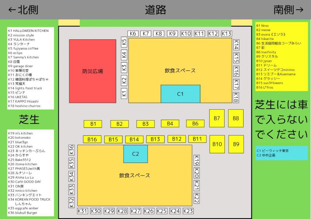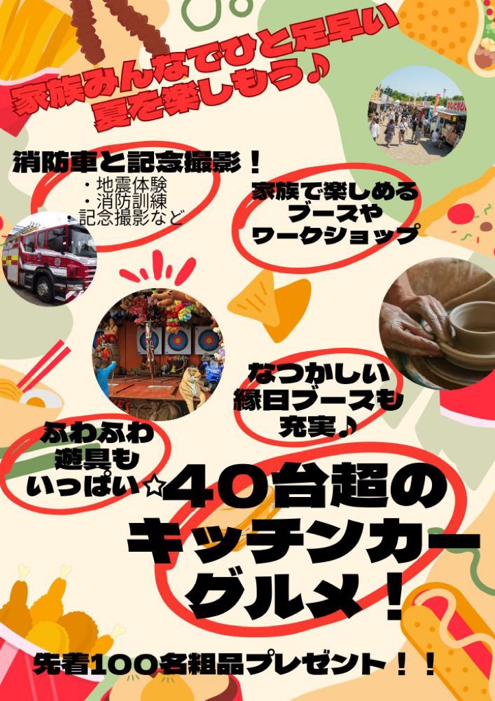 今回は、40台超のキッチンカー、消防&地震体験、縁日&ワークショップに、ふわふわ遊具の増量、モッティ(電動カー)も初登場すると伺っております。