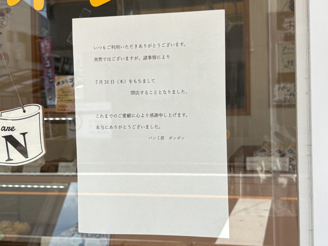 草加市草加にあるパン屋さん「パン工房 ボンボン」が閉店を発表されていると情報提供をいただきました。