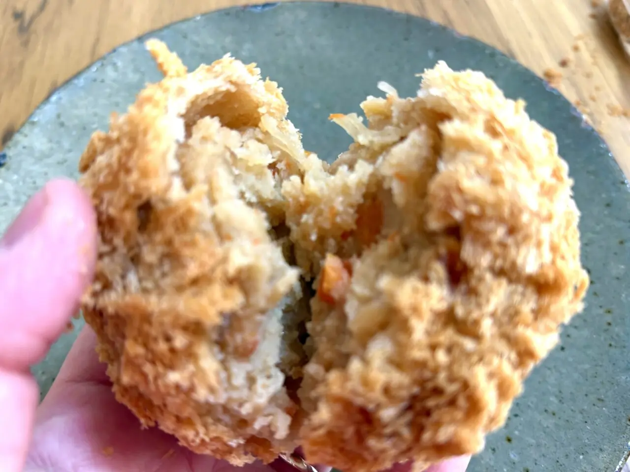 サクサクの薄めの衣で、肉じゃがをそのまま閉じ込めたような甘みもコクもある味わい。しっとりとした食感のコロッケです。