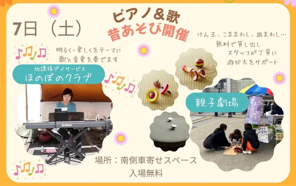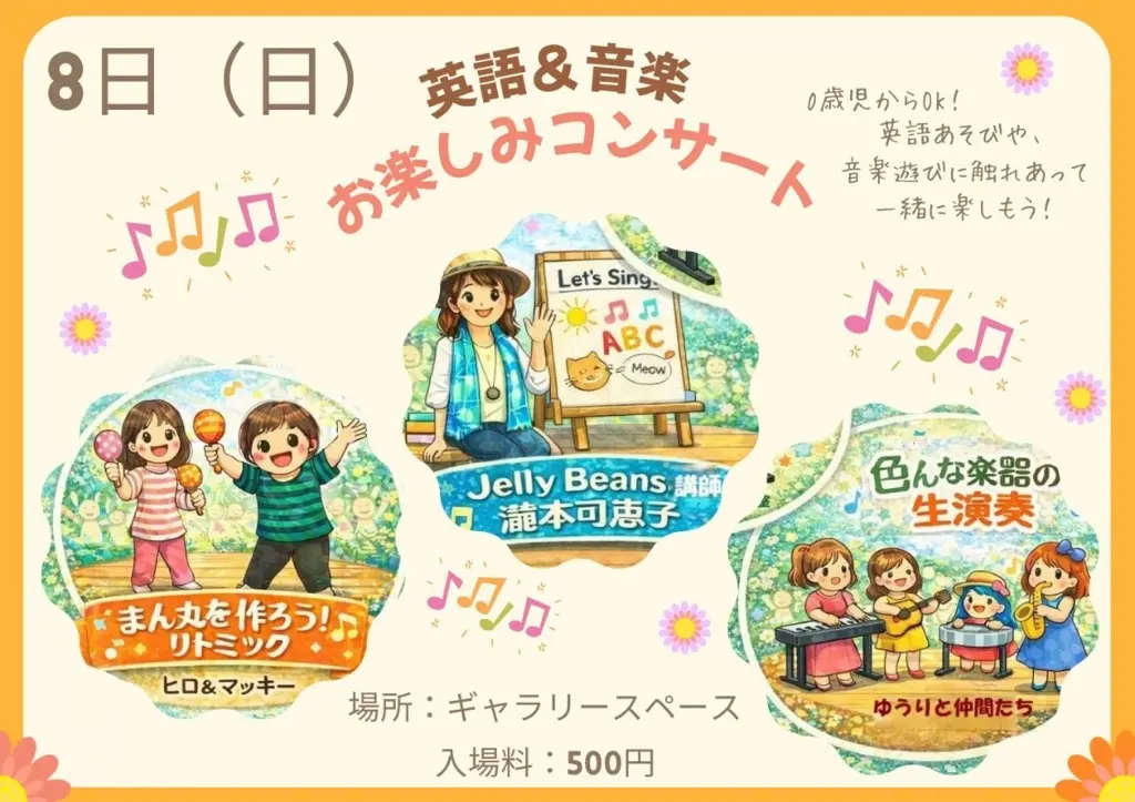 当日は、ハンドメイド作品やワークショップ、リラクゼーション、キッチンカーが出店され、その他、歌や音楽、昔あそび、英語のリトミックなどの開催が予定されています。